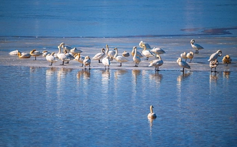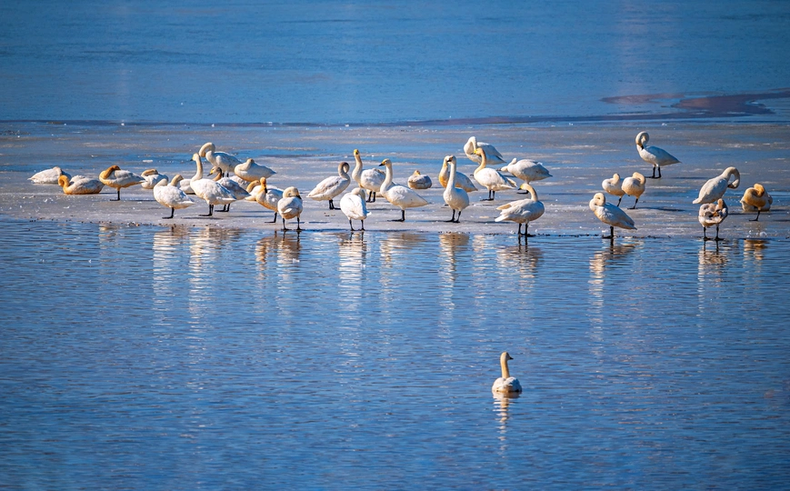 冰湖之上,一场自然的优雅盛会正悄然铺展。阳光漫洒,给洁白的天鹅群披上一层鎏金薄纱,连冰面与湖水的交界,都氤氲着诗意的朦胧。 天鹅姿态万千。有的静立如哲人,细长脖颈优雅弯折,倒影在澄澈湖水中轻晃,似与湖底的波光对话;有的低头梳理羽毛,细腻动作里藏着对生活的郑重,每一根羽丝都在阳光下闪烁温柔光泽;更有几只悠然游弋,双蹼划开涟漪,让冷冽的冰湖有了灵动的呼吸。它们或三五成群,以亲昵姿态诉说族群的温暖;或独处一隅,在天地间享受片刻静谧。冰的冷硬与天鹅的柔美碰撞,编织出刚柔并济的画面,恰似岁月里藏着的深浅情味。 这片天地,是自然馈赠的诗行。冰湖未因寒冷沉沦死寂,反因天鹅的存在焕发蓬勃生机。它们的每一次振翅、每一回静栖,都是对生命的深情礼赞。于此间,时光仿佛放缓流速,让人窥见自然最本真的模样——无需喧嚣,自有穿透人心的力量;不必张扬,处处皆是动人心魄的美丽。愿我们在纷繁尘世中,也能寻得一方如冰湖般的宁静角落,像天鹅般优雅栖息,于天地间舒展自在姿态,书写属于自己的从容人生篇章。 拍摄于明湖公园,每年这个季节,天鹅都会如约而至,做短暂停留后又飞往更北的北方而去,等秋天又会返回来,然后飞往南方。