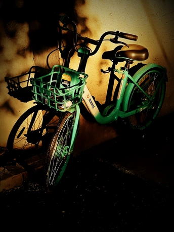 在旧墙斑驳的光影里, 绿色单车静静伫立。 车篮空荡,似等待着故事, 座椅沉默,承载过往昔。 影子在地上蜿蜒, 诉说着时光的痕迹。 它曾穿梭在热闹的街巷, 如今在这角落,独守回忆 。