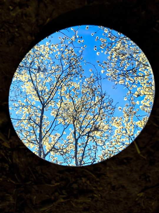 在白花公园景区,以蓝天为背景,拍摄了镜中的玉兰花,表现春意盎然的景象。