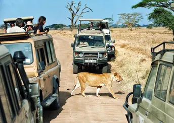 在非洲草原的土路邂逅狮子,车上的我们屏息观望,它走着从容的步伐,与我们擦肩而过 。
