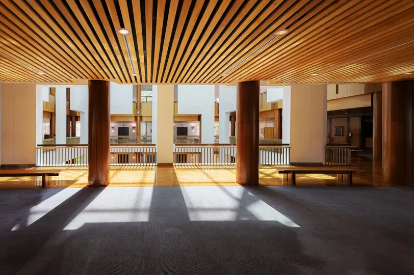 踏入澳大利亚议会大厦内部,仿若置身于艺术与权力交融的殿堂。木质横梁有序排列于天花板上 ,暖色调的光泽传递出沉稳与庄重。粗壮的立柱如忠诚的卫士,稳稳支撑起空间的格局。 阳光透过间隙洒落,在地面铺陈出光影的画卷,给整个空间增添了几分灵动与温暖。远处,层层叠叠的结构与错落有致的门窗,展现出建筑设计的精妙构思。长椅静静摆放,似在等待访客休憩,也见证着这里发生的每一次交流与思考。这里,不仅是政治活动的舞台,更是澳大利亚历史与文化底蕴的具象表达。