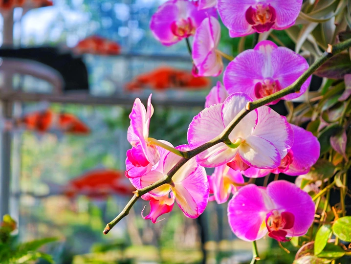 阳光洒落,蝴蝶兰宛如梦幻精灵,粉紫花瓣似蝶翼轻颤。背景中朦胧的红影,更添一份灵动与神秘,每朵花都在诉说着自然的绮丽诗篇 。