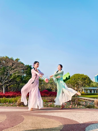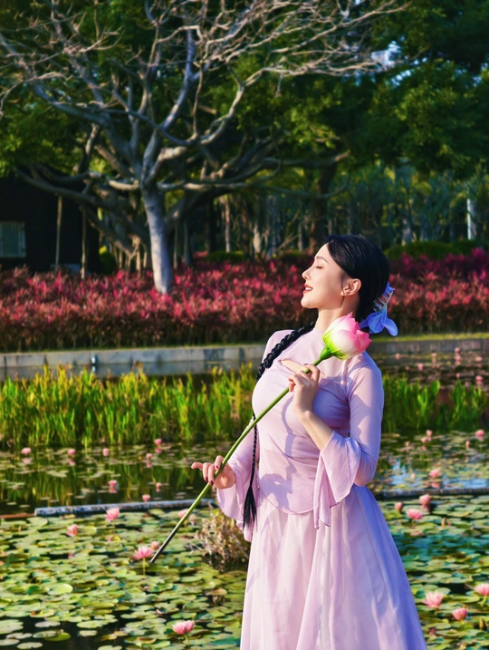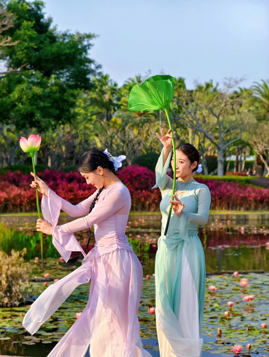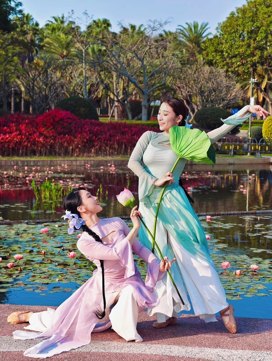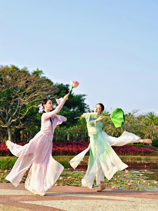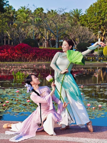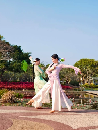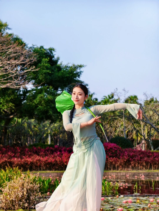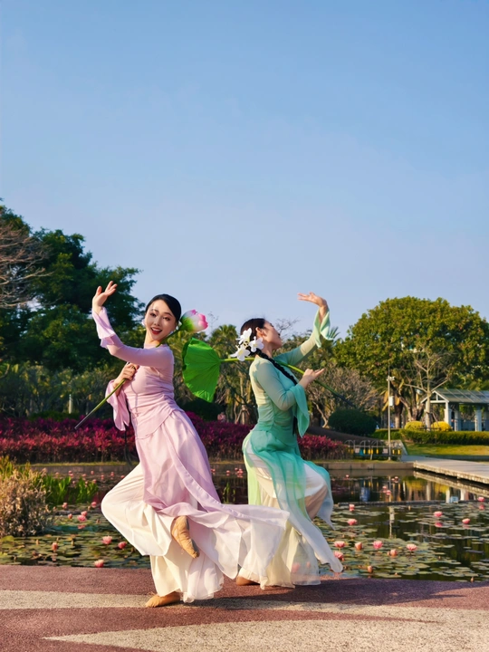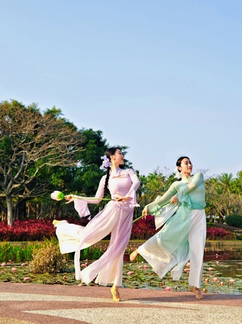 在夕阳的微风中,阳光轻轻洒在睡莲池畔,莲花带着丝丝暖意,优雅地绽放在碧波荡漾的水面之上。舞者穿着轻盈的舞衣,仿佛花瓣般飘舞在池塘周围,她们的舞姿如诗如画,柔美流畅,完全沉浸在自然的怀抱中。四周的鸟鸣和水面的涟漪,共同编织出一场自然与艺术的盛宴。