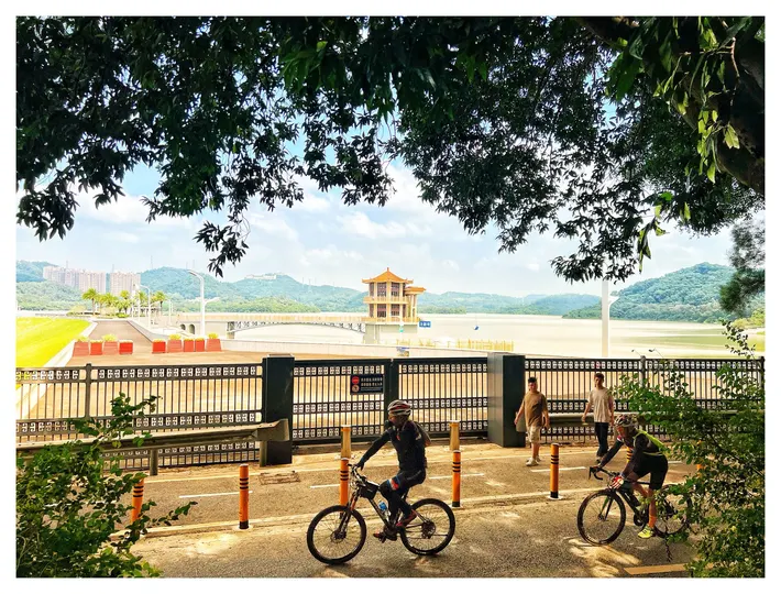 阳光倾洒,绿树成荫,骑行者们在这条惬意的道路上尽情驰骋。前方,中式风格的建筑静立,与远处的青山绿水相映成趣。围栏内外,有人悠然漫步,有人奋力骑行,一幅闲适的生活图景在这方天地徐徐展开,每一个瞬间都诉说着对生活的热爱与对自由的向往。