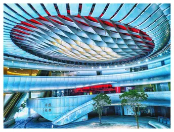 踏入这座建筑,仿若进入一个未来感十足的空间。独特的穹顶设计,线条如灵动的波浪相互交织,红与银灰的色彩碰撞,赋予视觉强烈的冲击。层层叠叠的回廊与扶梯,构建出复杂而有序的结构 ,几棵绿树点缀其间,为冷峻的建筑增添了一抹生机。这里,是艺术与建筑完美融合的殿堂。