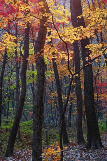 踏入这片秋日彩林,粗壮树干撑起斑斓树冠。金黄与火红的叶片交错,残留的翠绿点缀其间。落叶铺满地面,阳光丝丝缕缕穿透枝叶,在地上绘出光影图案,展现了秋色的绚烂与静谧。