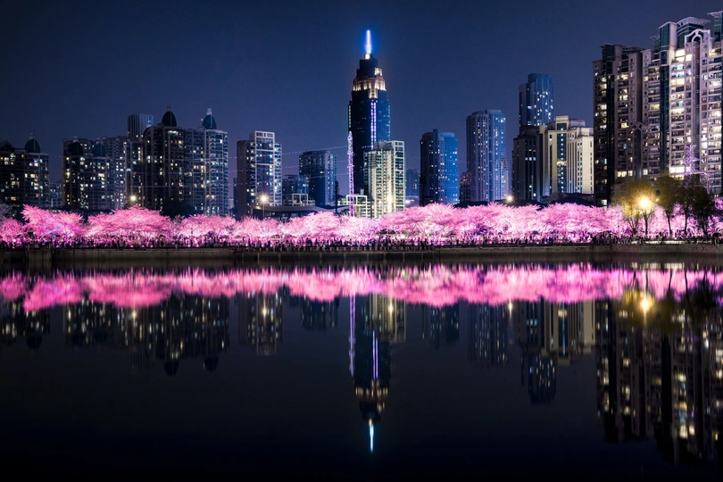 📸:对称构图强迫症狂喜!樱花大道千株染井吉野盛放,粉白花瓣被夜色镀上霓虹,背后平安金融中心的玻璃幕墙倒映湖中,光影与春色在镜头里定格成诗——这就是武汉独有的“摩天楼下的樱花浪漫”吧! ✨ 拍摄灵感 夜灯初上时,湖面如镜,樱花与高楼的光影在水面交织成对称画卷。镜头压低,让倒影占据画面一半,长曝光捕捉灯光流转的轨迹,粉樱与冷调建筑碰撞出赛博春天的氛围感。
