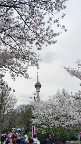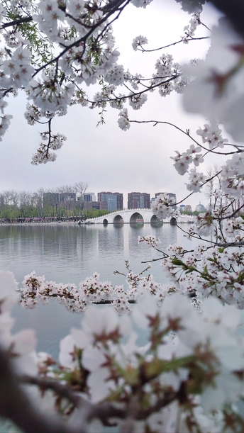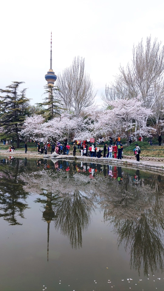 春日的公园,湖水如镜,倒映着烂漫樱花与挺拔的电视塔。岸边人群熙攘,或赏景,或留影,欢声笑语交织。樱花如雪飘落,晕染出一抹温柔春色,在城市一隅绘就出灵动的春日画卷。