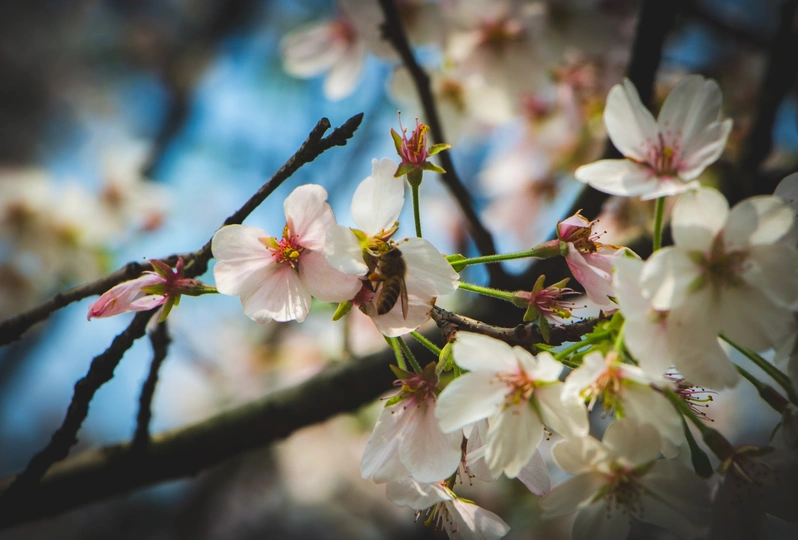 春日里,樱花绽放,洁白粉嫩的花瓣间,蜜蜂忙碌穿梭,奏响一曲生机与美好的乐章。