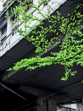 过街天桥下,偶然看到了树上已经吐露出浓烈绿色的嫩叶,想不到在这繁华都市,还能目睹如此炫目的春天景致!