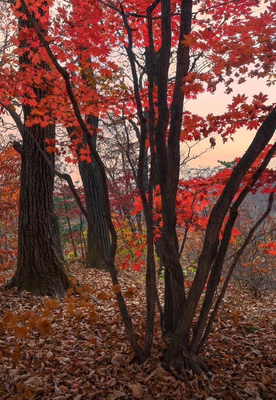 画面的叶片呈现出浓郁的红色,在阳光的映衬下显得格外鲜艳。粗壮的树干向上延伸,叶片繁茂,层层叠叠地铺满了枝头。地上散落着厚厚的落叶,突出了季节的变化。背景的天空色调柔和,与红枫叶的艳丽色彩形成对比,整体画面充满了深秋的氛围。