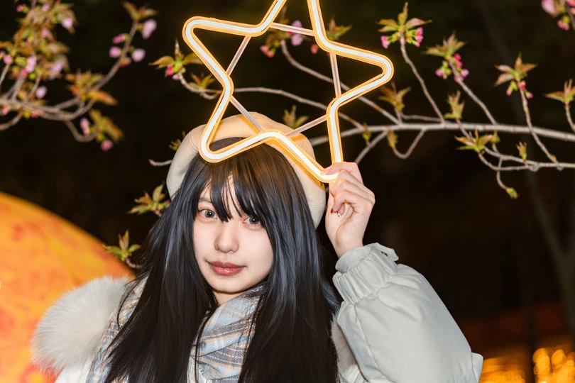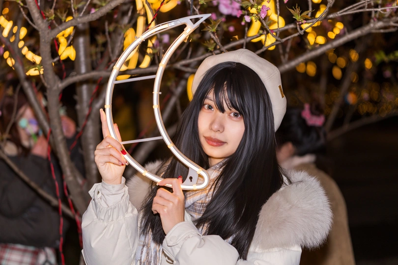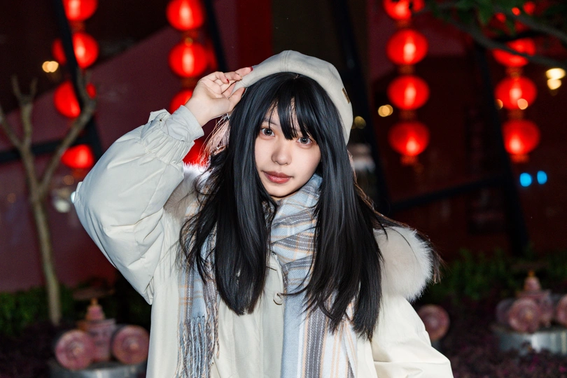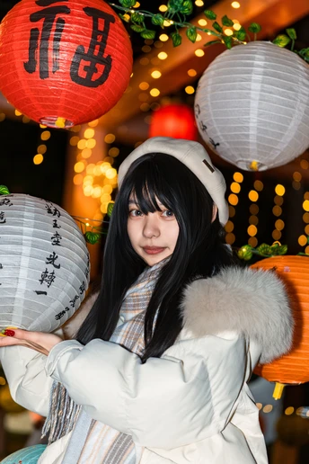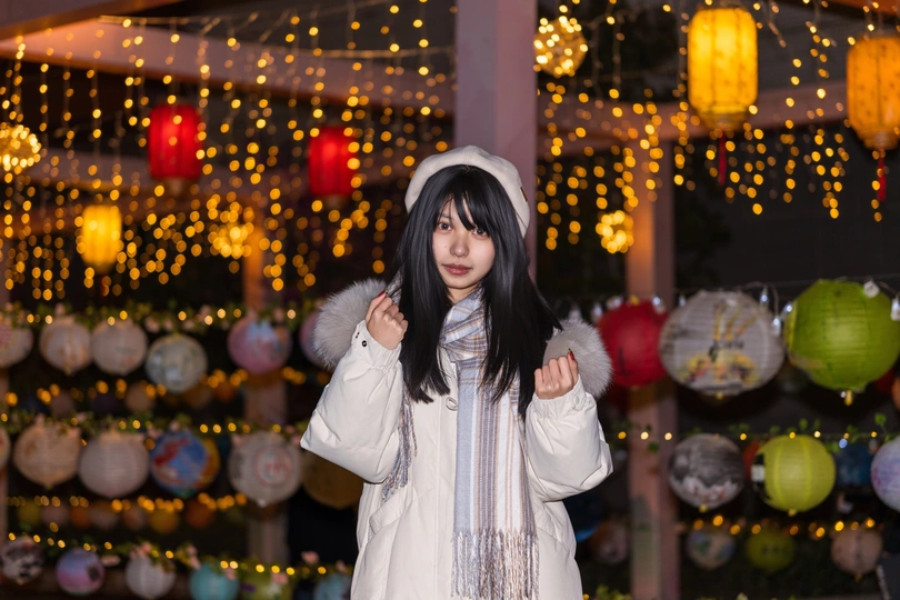 白色羽绒服与红灯笼的撞色对比,在暖调光晕中格外醒目。人物自然倚靠灯笼架,指尖轻触竹骨灯框,背景里数百盏灯笼高低错落,既有传统书法红绸灯,也有现代感的白纸方灯。