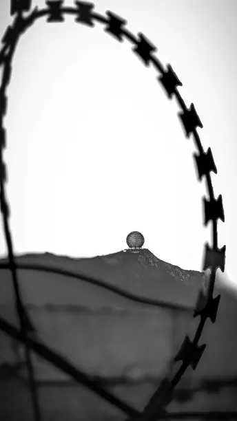 画面中,“海上生明月”球形建筑孤独矗立山顶。它本是旅游度假村的标志建筑,承载美好愿景。却因项目方管理不善、资金断裂而停工。前景的铁丝网似枷锁,锁住这未竟之梦,徒留遗憾,诉说着繁华夭折的无奈与惋惜。