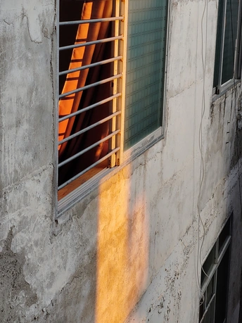 落日余晖,残阳如血,照在了隔壁房子的窗纱上。 我站在窗边,看到了这一幕,便记录了下来。