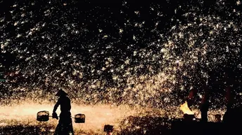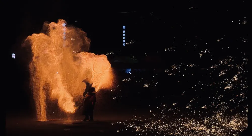 在深邃的夜幕之下,打铁花如梦幻般的烟火盛宴徐徐展开。炽热的铁水被奋力击起,瞬间迸溅出万千璀璨的星芒 。那飞溅的铁花,似流萤飞舞,又似银河倾落,在黑暗中肆意绽放。表演者的身影坚毅而果敢,在铁火的映照下,勾勒出古朴而动人的轮廓。每一次铁花的绽放,都是力量与美的交融,是传统技艺在时光中的惊艳回眸,它承载着岁月的记忆,点燃了人们对古老文化的无限遐想与热爱。