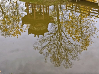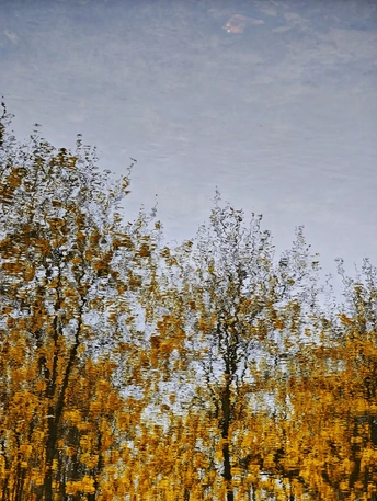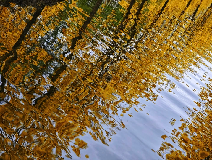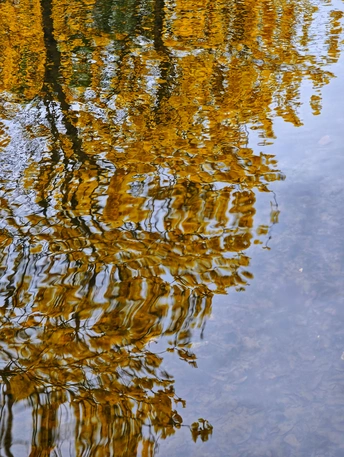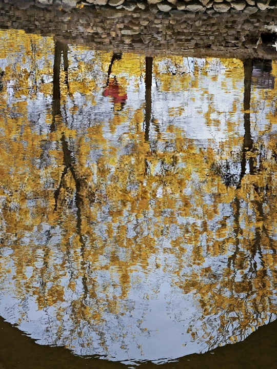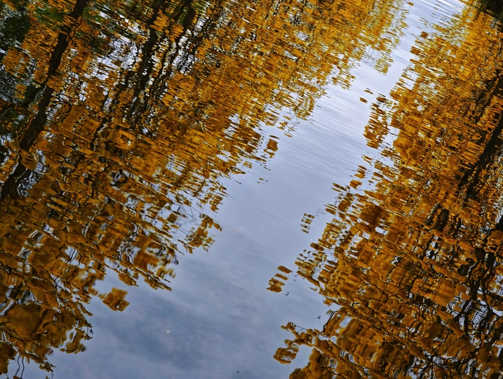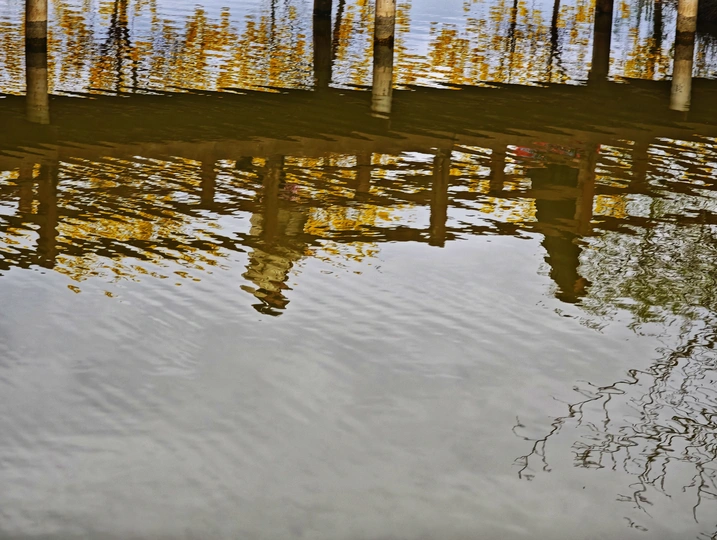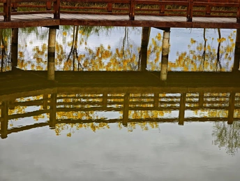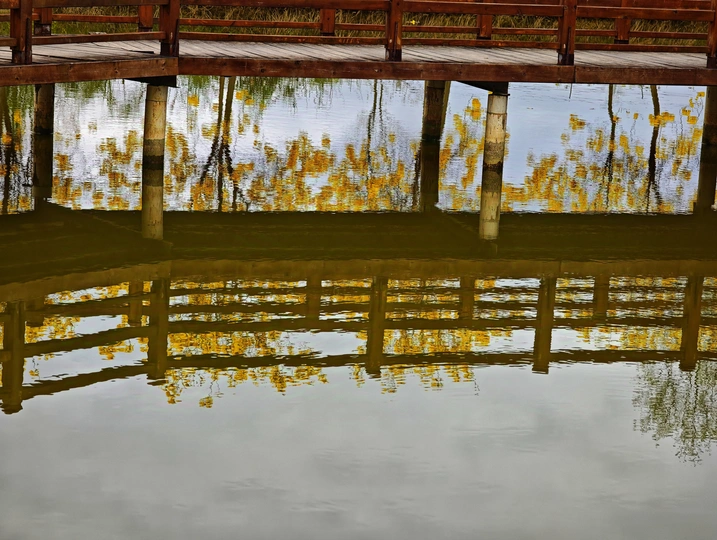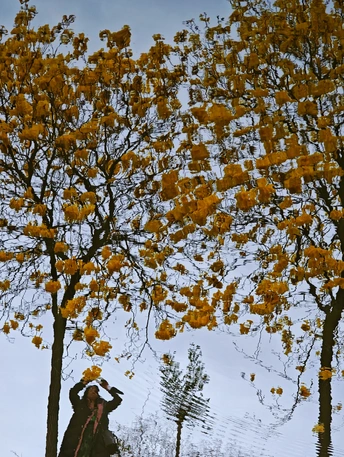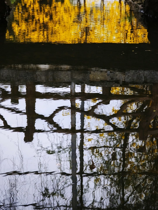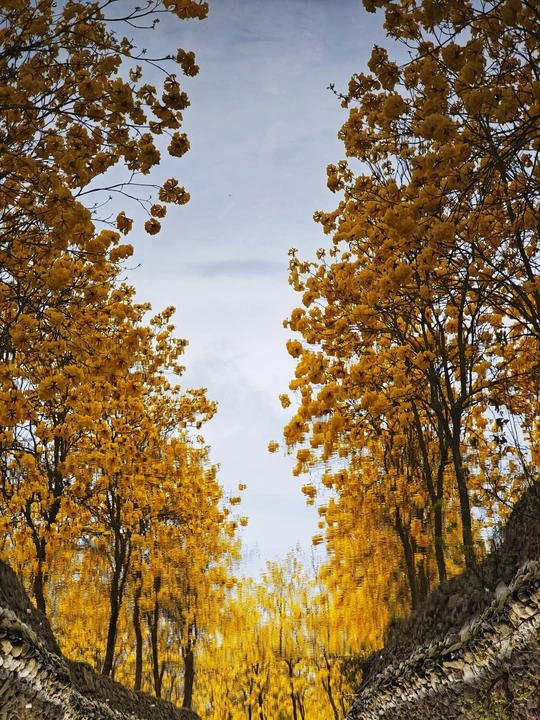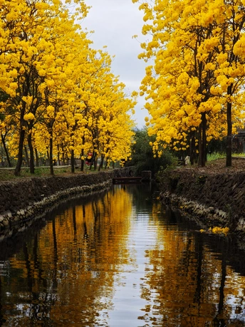 这组图大量利用水面倒影,将树木、桥梁、亭子等景物上下对称呈现,营造出平衡、和谐美感,增强画面秩序感与形式美,如树木枝叶与水中倒影相互映衬,视觉上极具冲击力。部分画面中,树木枝叶形成天然框架,引导观者视线聚焦画面中心或特定景物,增加画面层次感与深度 。 以金黄色的黄风铃为主色调,搭配水面的浅色调,形成鲜明又和谐的色彩组合,凸显秋日氛围,色彩饱和度与明度控制得当,既不过于浓烈刺眼,也不显得暗淡,视觉感受舒适。 从贴近水面的低角度拍摄,使得倒影在画面中占比较大,强化倒影效果,突出景物在水中的镜像之美,同时给人独特视觉体验,展现平常视角难以见到的画面。 利用阴天的自然光拍摄,光线柔和均匀,避免了强光产生的生硬阴影与高光过曝问题,让树叶色彩和水面质感细腻呈现,光影效果为画面增添了静谧、柔和氛围。 组图形式增强表现力,多图组合成系列作品,从不同场景、角度展现同一主题(水景),丰富了视觉内容,深化主题表达,观者能更全面感受拍摄场景的秋景之美,也体现摄影师对拍摄主题的深度挖掘与呈现能力。