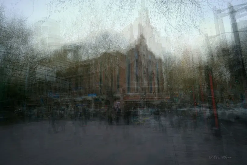 照片拍摄于上海国泰电影院门前,这里每天都人来人往川流不息。 这一建筑也成了上海古老建筑的一个代表,见证了百年沧桑。 无数人曾驻足这里进行拍摄,在我拍照片的时刻,正有一群老外在这里架设着长枪短炮。 因此,我用多重曝光的方式,堆叠不同人眼中的这一经典形象,汇聚成了一幅抽象的画。