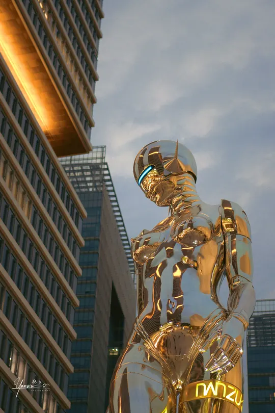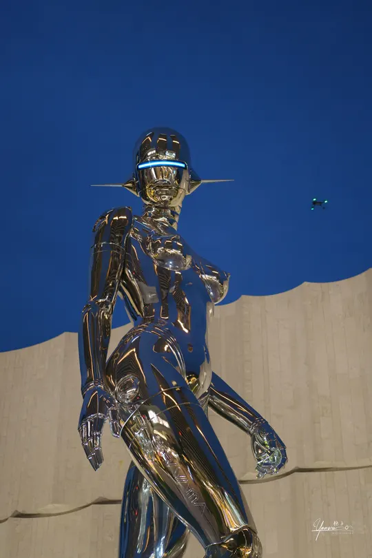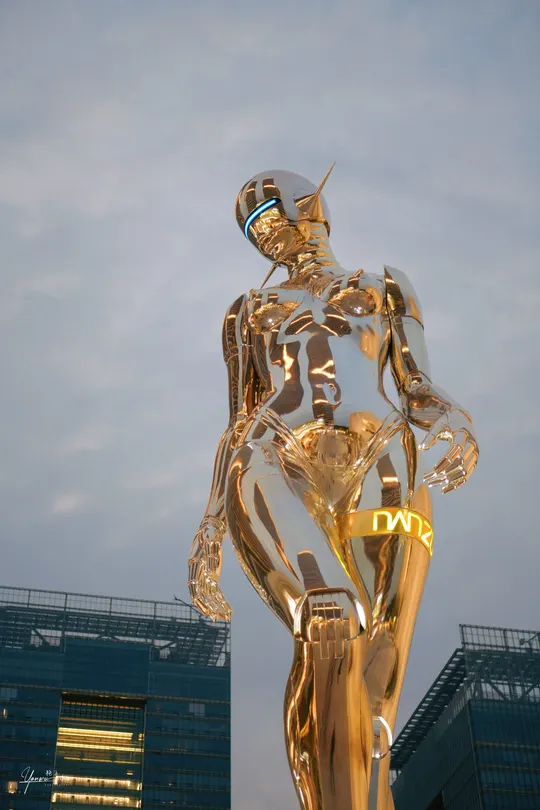 上海还是太超前了~这简直赛博情欲天花板。继去年KAWAS现身北外滩引爆人流,高达12米的 Sexy Robot雕塑现身浦东。 超现代的赛博朋克机械感,结合女性肉体曼妙曲线的美感。白天金属光泽冷艳夺目,夜晚灯光下科幻感拉满,随手一拍都是赛博朋克大片!
