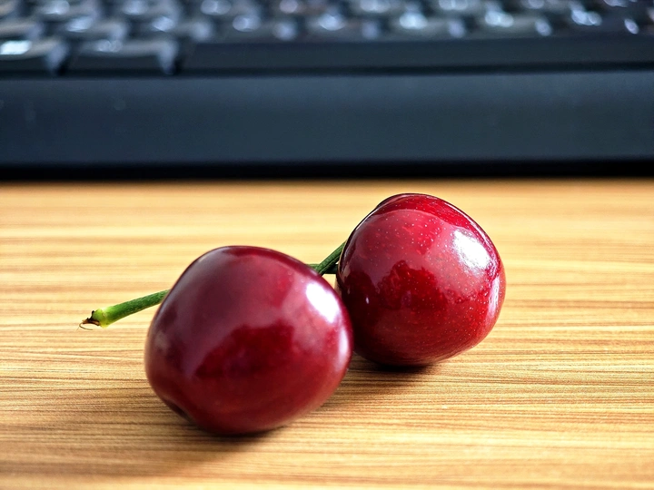 在繁忙的工作间隙,两颗车厘子静静地守候在键盘旁,带来一丝清新与甜蜜