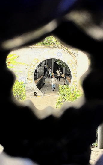 一个小男孩,满脸开心的向前跑着,从这窗花看过去他仿佛在朝着春天进发,朝气蓬勃,让人心生向往。