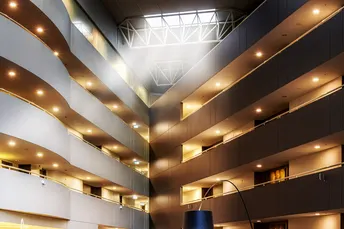踏入这栋建筑内部,仿若置身于一个光影交织的梦幻之境。层层叠叠的楼层以独特的曲线延展,金属与板材的质感在灯光下交相辉映。暖黄色的灯光从天花板与壁间倾洒,营造出温馨而现代的氛围。 顶部的天窗引入自然光,与室内灯光交融,朦胧的光晕似在空间中舞动。这里,建筑的线条与光影完美结合,每一处细节都诉说着设计的匠心独运,让人沉浸于这充满艺术感与现代感的空间之中。