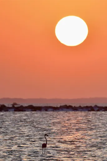墨西哥海岸,夕阳西下,一只形单影只的火烈鸟独自在海中伫立,与同样形单影只的我一起欣赏着日落美景