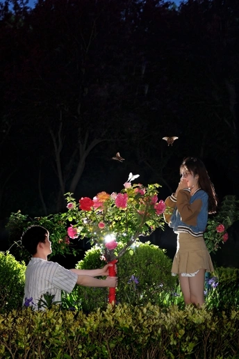 人间四月天,校园里的树桩月季长势正旺。 约上得意的男弟子和他钟情的女孩,布置好场景,拍摄下这张特别版的“表白照”。 具象化校园爱情的美好。