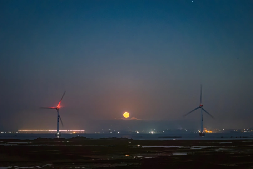 随着现在新能源的不断发展,清洁自然能源逐渐被重视起来,借着在沿海生活的契机,找到了一片海上风里发电场区,用软件来计算了月亮升起的方位和时间,然后借着海上风电与月亮的同框,拍下了这张照片,同属于大自然之下,人类善待自然与合理利用大自然成为了和谐共生的结合点。