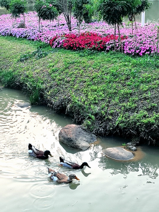 岸上花团锦簇,绿草如茵,水里鸭子在欢快地戏水,这不就是“竹外桃花三两枝,春江水暖鸭先知”嘛!