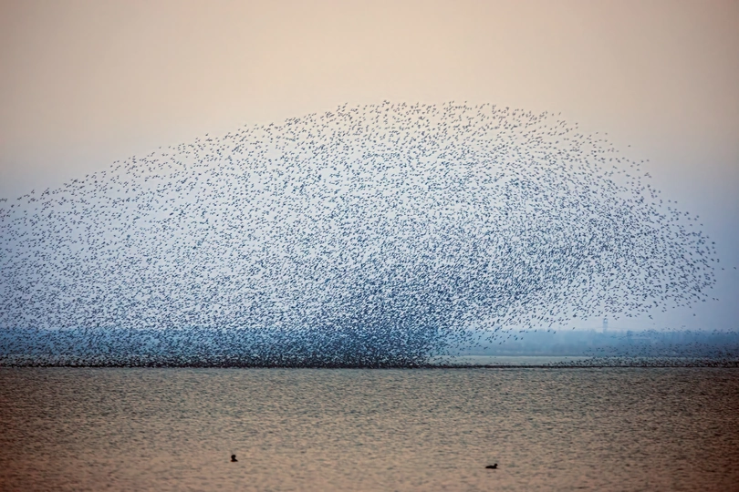 水面之上,无数鸟儿齐飞,如同一波巨大的浪潮在空中翻涌。它们紧密排列,动作整齐划一,忽而升高,忽而降低,仿佛是大自然指挥下的舞者。这神奇的鸟浪,是生命活力的展现,让人惊叹于大自然的鬼斧神工。