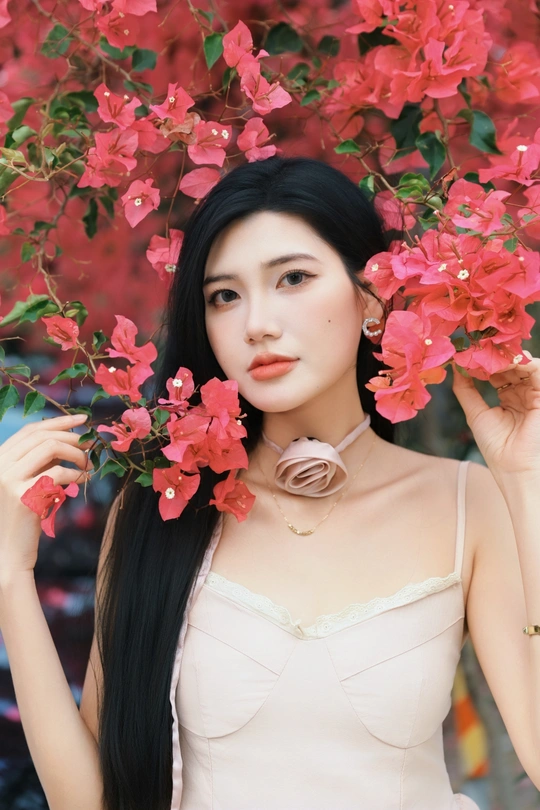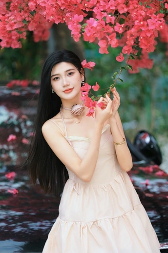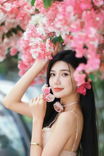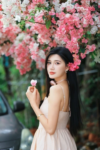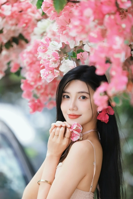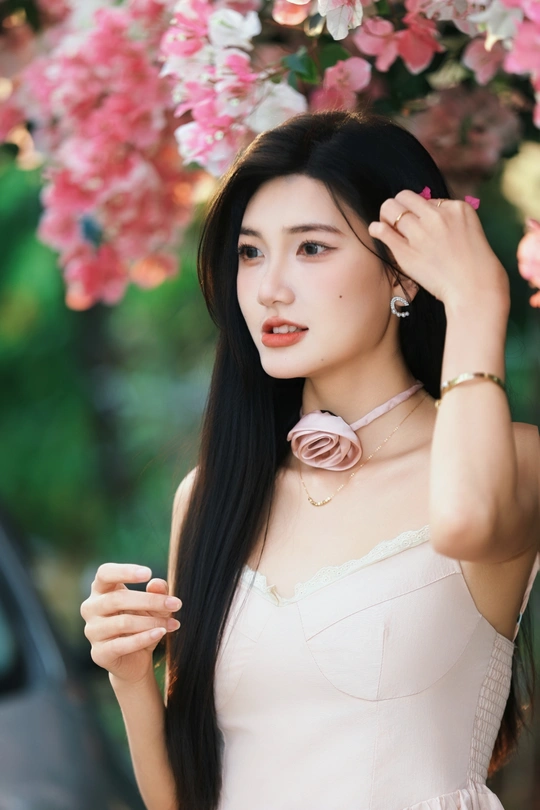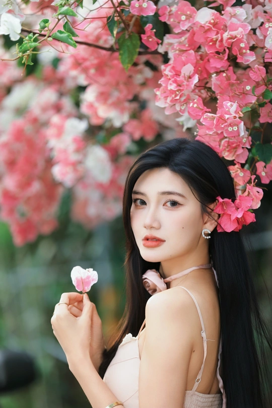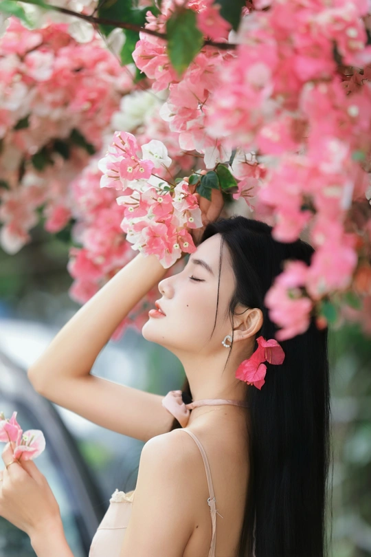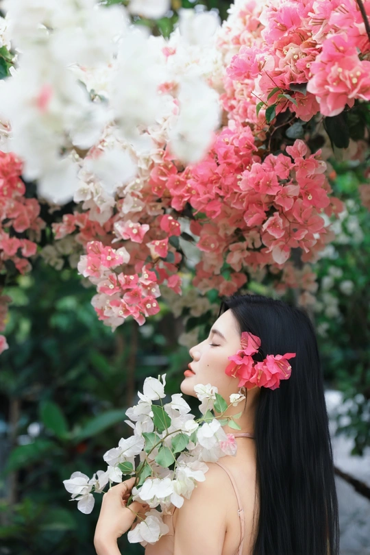 在繁花簇拥间,她似是与春日融为一体。轻闭双眸,任花瓣落于肩头发间,这一刻,时光仿佛静止,只余花香萦绕,她于这方天地,邂逅着独属于自己的浪漫与温柔。