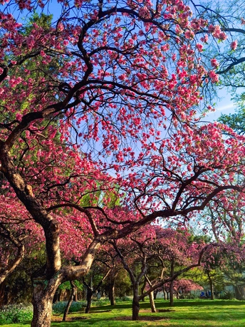 这张照片展示了一棵开满粉红色花朵的垂条海棠大树,树枝蜿蜒伸展,花团锦簇。背景是一片蓝天和远处的绿树,整个场景显得非常宁静而美丽,整体构图布局捕捉到画面中的美感与季节特征。
