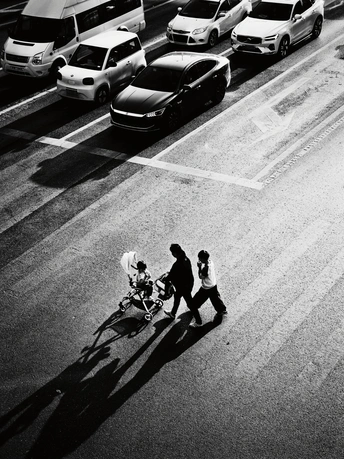 车流在上方织成金属的河, 他们在下方走着, 婴儿车是移动的摇篮, 影子被拉得很长, 像一串 被阳光晒硬的 省略号。 孩子蹦跳的脚步, 母亲平稳的节奏, 还有车轮碾过路面的轻响, 在这黑白的琴键上, 合奏着 属于人间的 寻常与安祥。