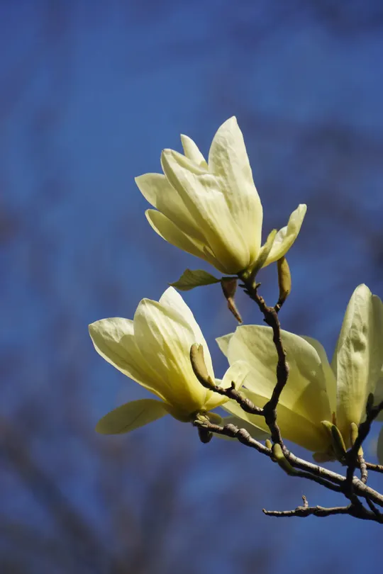 春日晴空下,几枝玉兰花优雅绽放。淡黄的花瓣如温润的玉片,在澄澈蓝天的映衬中,静静舒展着独有的风姿。没有喧嚣,只以这般素净之美,诉说着季节的温柔与浪漫。