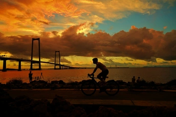 迎着日出骑行,在桥边追逐曙光,每一次踏板的转动,都是对新一天的热忱奔赴,前路皆有希望。