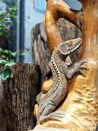 逛手工人造街,到处充满艺术味,一根雕店门,走到跟前被这活灵活现的动物根雕吓一跳,这真的太像了,我也比较怕爬行动物,来张特写暴光它!