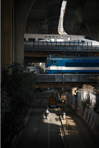 在昆明遇到了一个很有特色机位,我选择这样拍。 铁路上的和谐号和火车交替而过,跨时代的中国速度就这样被我定格下来。