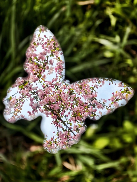 这是买了一个小镜子,放在地上,树上的花就映在镜子里了,然后对着镜子拍照。