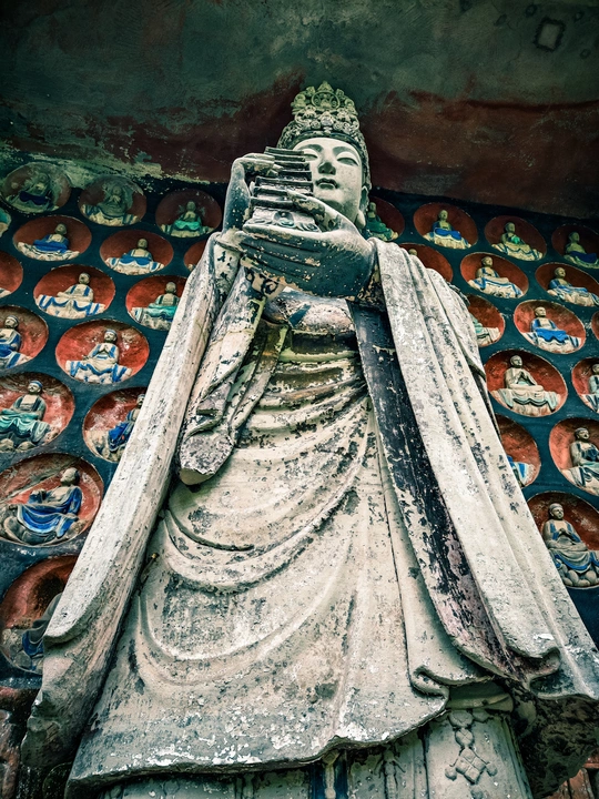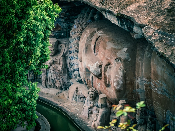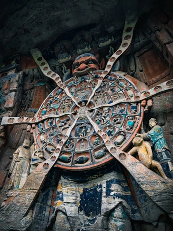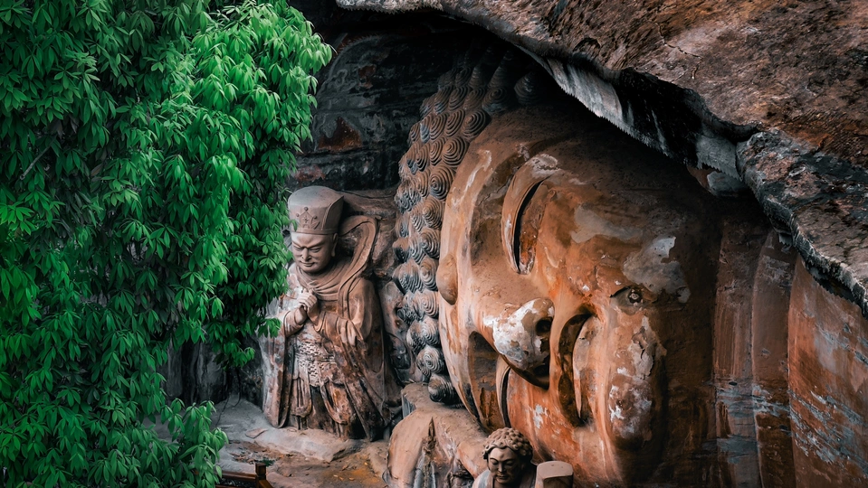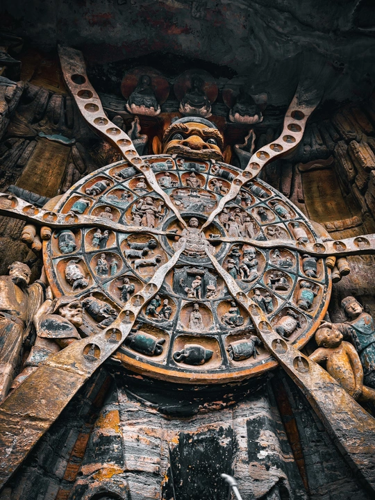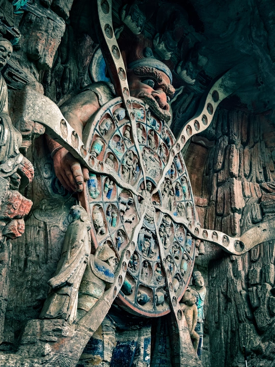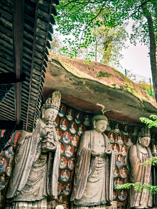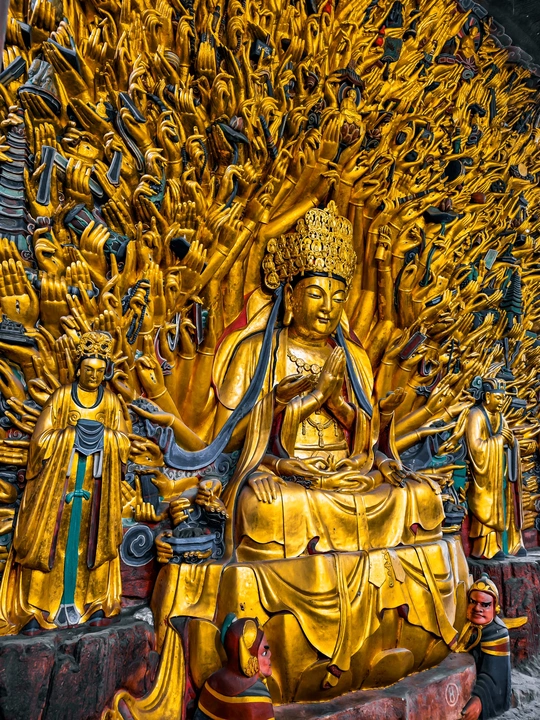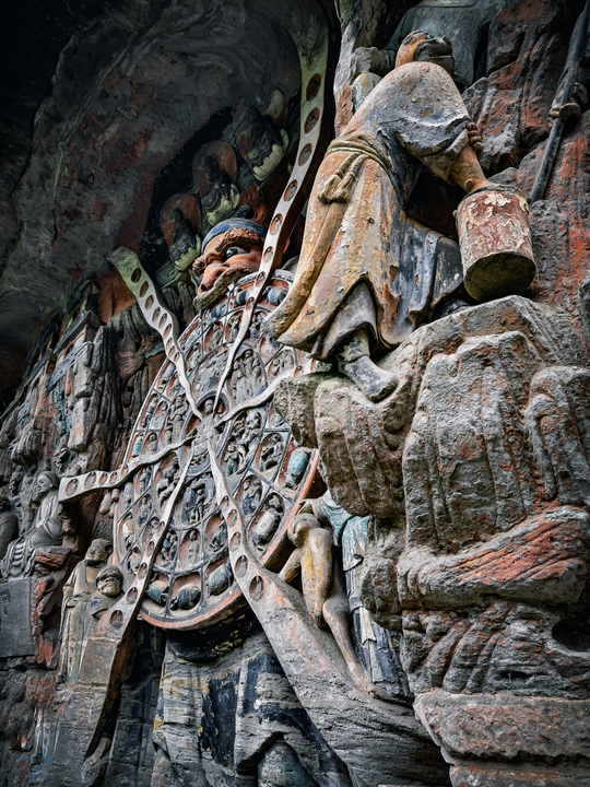 大足宝顶山石刻:崖壁上的南宋史诗 大足宝顶山石刻(世界文化遗产)位于重庆大足区,由南宋高僧赵智凤历时70余年主持开凿,是中国晚期石窟艺术的巅峰之作。其以U形峡谷为天然画布,500米崖壁上密布31组造像,将佛教密宗教义与宋代世俗生活完美融合,被誉为“石头上的百科全书”。 核心亮点 千手观音:830只金手如光轮绽放,历经修复仍金光璀璨,展现南宋贴金绝技; 释迦涅槃图:31米卧佛仅露半身,下半隐入山岩,以虚写实震撼人心; 六道轮回图:巨型轮盘图解因果哲学,獠牙鬼王托举众生百态; 牧牛图:十幕驯牛场景隐喻禅修心境,艺术化演绎“调伏心性”之道。 石刻突破传统技法,圆雕、线刻并用,人物衣袂翩然,表情鲜活如生。造像题材兼顾宗教与民生,既有地狱警示,亦有养鸡女等生活场景,折射宋人“佛法在人间”的智慧。 贴士:建议晨间游览避人流,搭配语音导览解码玄机,崖壁千年风霜与匠心在此共鸣。