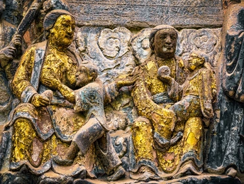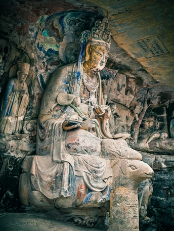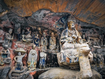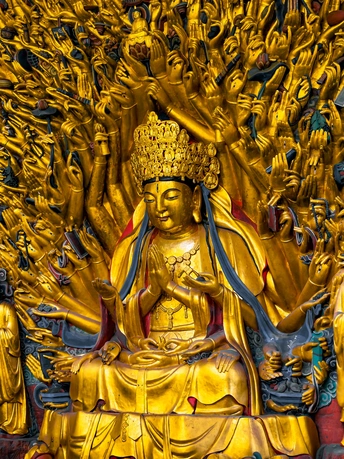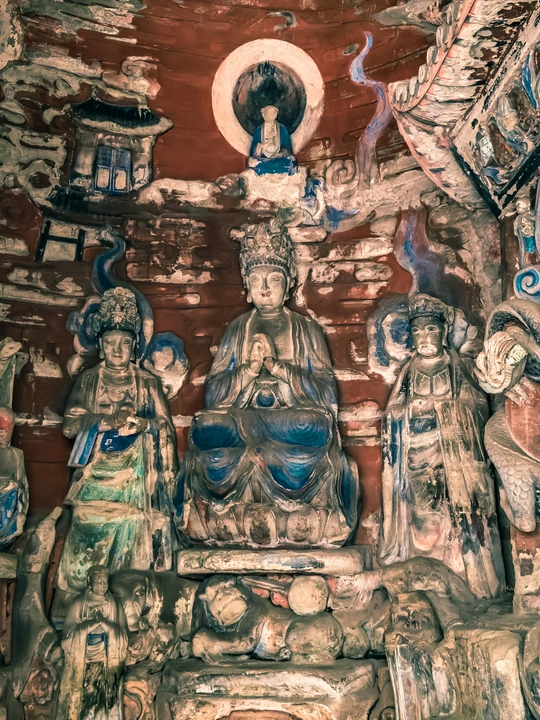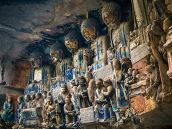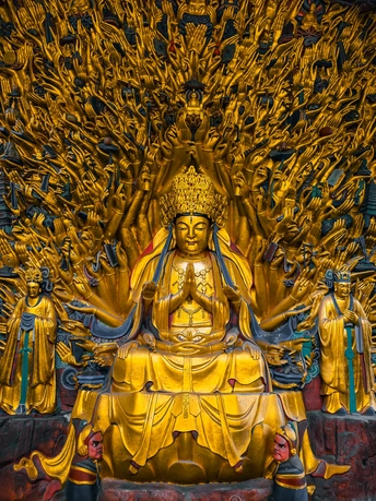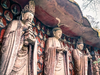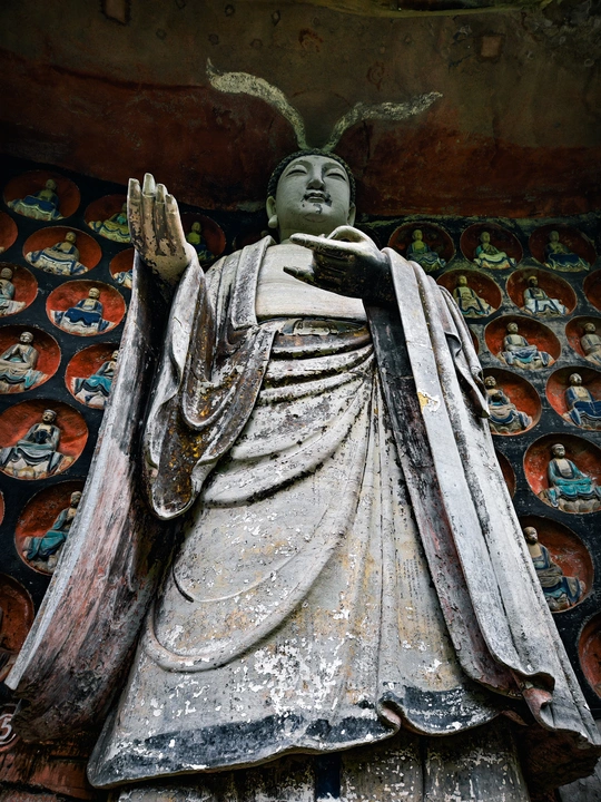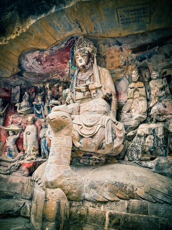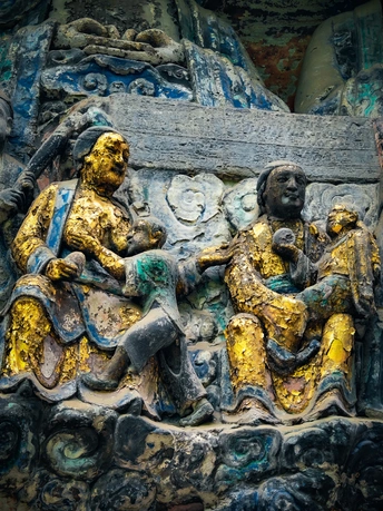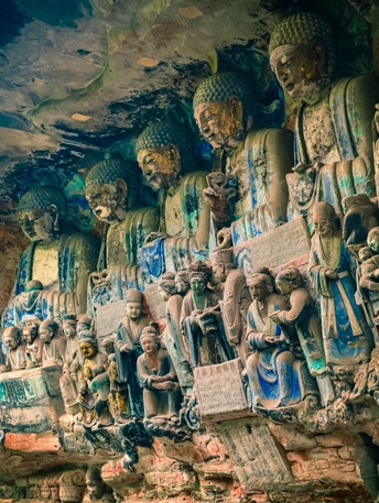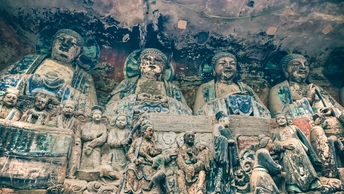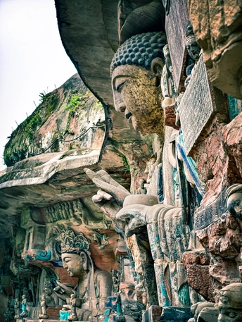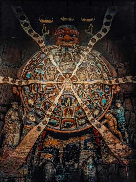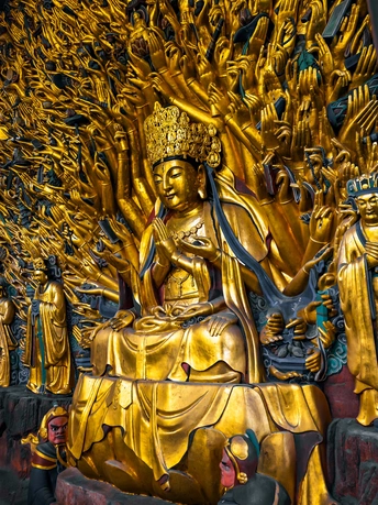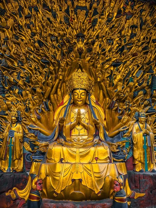 大足宝顶山石刻:崖壁上的南宋史诗 大足宝顶山石刻(世界文化遗产)位于重庆大足区,由南宋高僧赵智凤历时70余年主持开凿,是中国晚期石窟艺术的巅峰之作。其以U形峡谷为天然画布,500米崖壁上密布31组造像,将佛教密宗教义与宋代世俗生活完美融合,被誉为“石头上的百科全书”。 核心亮点 千手观音:830只金手如光轮绽放,历经修复仍金光璀璨,展现南宋贴金绝技; 释迦涅槃图:31米卧佛仅露半身,下半隐入山岩,以虚写实震撼人心; 六道轮回图:巨型轮盘图解因果哲学,獠牙鬼王托举众生百态; 牧牛图:十幕驯牛场景隐喻禅修心境,艺术化演绎“调伏心性”之道。 石刻突破传统技法,圆雕、线刻并用,人物衣袂翩然,表情鲜活如生。造像题材兼顾宗教与民生,既有地狱警示,亦有养鸡女等生活场景,折射宋人“佛法在人间”的智慧。 贴士:建议晨间游览避人流,搭配语音导览解码玄机,崖壁千年风霜与匠心在此共鸣。