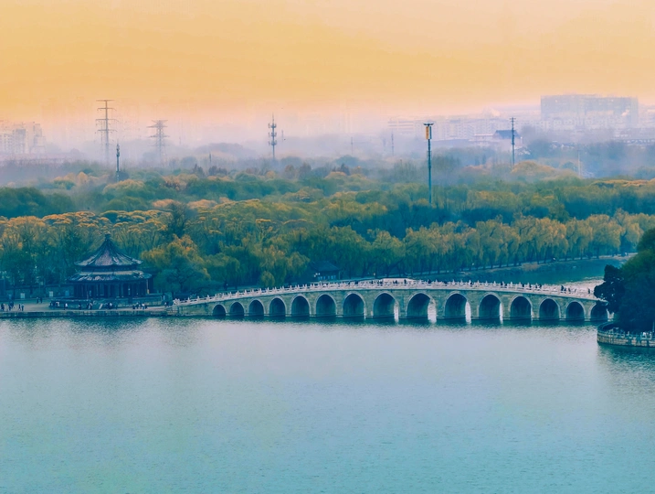 这张照片展示了北京颐和园著名的十七孔桥,横跨在宁静的昆明湖湖面上,远处是一片茂密的树林和隐约可见的城市建筑。天空呈现出淡淡的橙黄色调,记录了夕阳西下黄昏时分的氛围与美感。