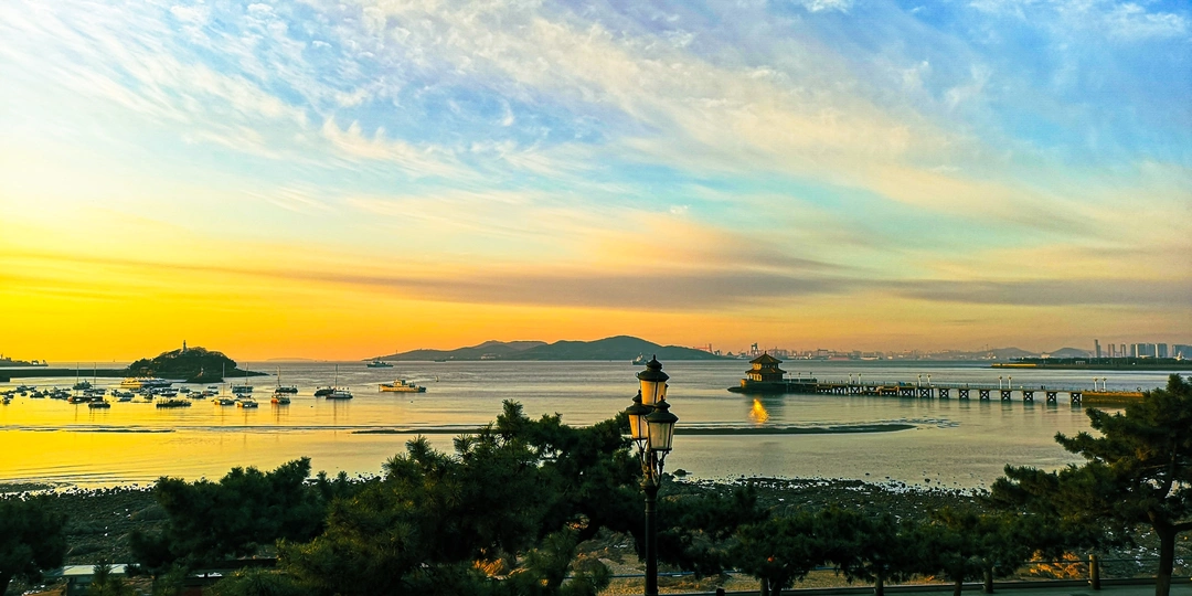 这张照片展示了著名的青岛栈桥海滩日出前的景象。天空被染成了金黄色和蓝色,远处可以看到山脉和城市建筑的轮廓。近处是一片平静的海面,上面停泊着几艘船只,岸边有一些树木和路灯,充分展现画面中自然美景与人文元素结合的独特氛围。