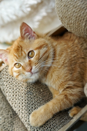 橘猫卧于猫抓板,眸光澄澈,似有灵犀。暖绒绒的身躯,光影柔和,营造温馨氛围,将猫咪的乖巧可爱完美呈现。