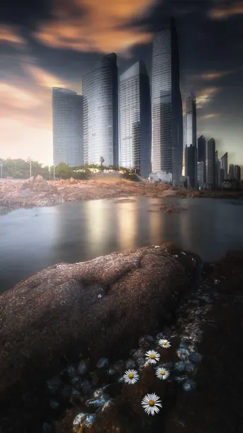 夕阳的余晖洒在海面,波光粼粼,与城市的钢铁森林相映成趣。脚下的礁石粗糙而坚硬,几株小雏菊顽强地生长着,白色的花瓣在微风中轻轻摇曳。这些小雏菊就像这座城市心中未灭的希望,即便身处艰难环境,依然努力绽放。