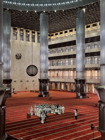 伊斯蒂赫拉尔大清真寺,阿拉伯语“伊斯蒂赫拉尔”意为“独立”,象征着印尼从荷兰殖民统治下获得独立。位置:位于印度尼西亚首都雅加达市中心的塔曼维加亚库苏玛公园,毗邻独立广场和雅加达大教堂。 主体建筑是一个直径45米的白色大圆屋顶覆盖的中央礼拜大厅,面积达1万平方米。整个建筑全部用大理石铺设,仅大理石柱就有4400根。