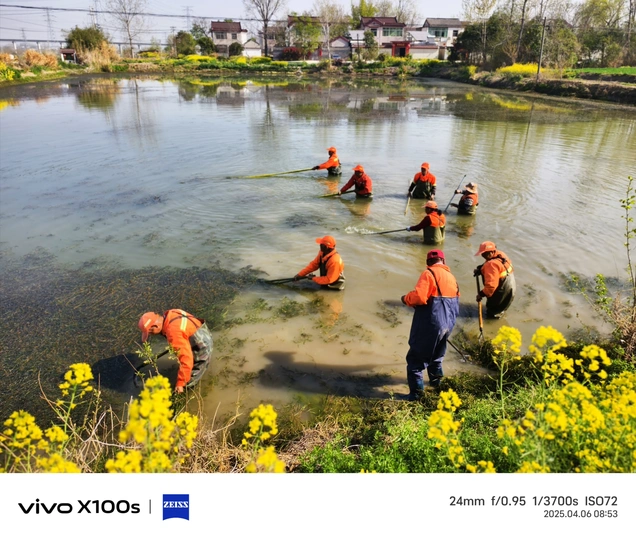 春暖花开,池塘水草茂盛, 村里负责环境卫生的老人们身着显眼的工作服团队通力合作, 边劳作边聊天,气氛甚好。 江苏扬州刘集镇。