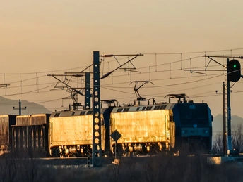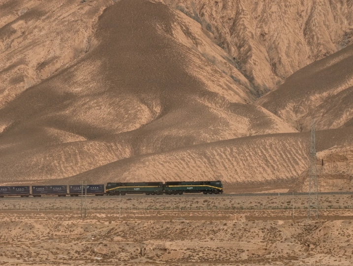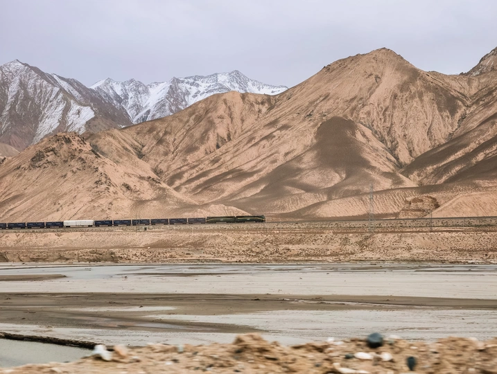 青藏铁路穿越在壮丽的山脉之间。远处可以看到覆盖着积雪的山峰,而近处则是干燥的土地和平坦的地貌。青藏铁路是中国的一条重要铁路线,连接了青海省西宁市与西藏自治区拉萨市,全长约1956公里。这条铁路不仅是一条重要的交通线路,也是一道美丽的风景线,沿途可以欣赏到高原独特的自然风光。