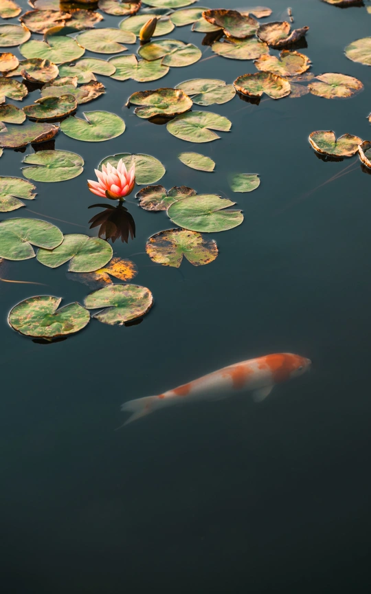 睡莲静卧镜池纱,锦鲤悠然曳赤霞。 天水熔金鳞尾动,忽疑红墨散成花。