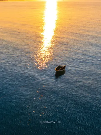 无人机视角定格凌晨6:38 当第一缕光刺破靛蓝绸缎 浪尖的碎钻与渔船的剪影撞个满怀 波光不是海面的纹路,是太阳洒向人间的碎金箔 而那艘独享晨曦的小船,正把整片海域私藏成自己的画框