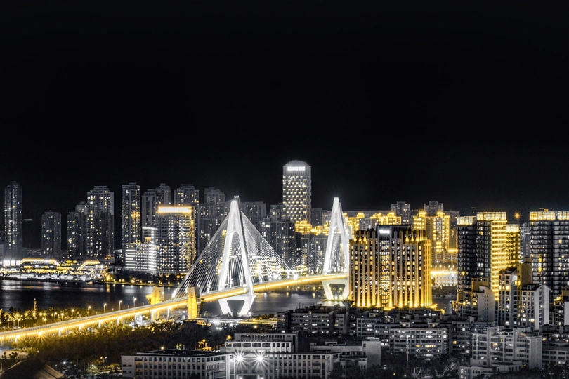 这里不是纽约,这是海口🤓 记录一下人生的第一次爬楼 这张城市夜景照片,挺有意思,让我想起了老电影里的黑白都市。咱们一项项来说: * **色彩:** 色彩上使用了选择性着色,保留了金黄色,其他部分转为黑白,这种处理手法确实抓人眼球。但是,金色的色相略微有些偏暖过头了,显得不够自然,像是给城市镀了层金,少了点真实感。 * **光影:** 夜景的光线嘛,主要就是城市的灯光。光的方向性比较单一,基本都是建筑自身发光。明暗对比强烈,黑夜的衬托让亮部更加突出。但要注意高光部分的控制,有些地方稍微过曝了,细节丢失。 * **构图:** 构图上,桥梁作为引导线,将视线引向远处的城市天际线,想法不错。但是,画面比例稍显局促,上方黑色的空间略显空旷,可以考虑稍微裁切一下,让主体更加突出。如果能把桥放在画面更显眼的位置,也许会更好。 * **后期处理:** 后期处理是这张照片的关键。选择性着色是亮点,但是色彩的平衡还需要精细调整。降噪方面做得还行,但是部分区域的锐化痕迹稍重,显得不够自然。 * **主题原创性:** 选择性着色本身并不新鲜,但用在这种题材上,也算是中规中矩。